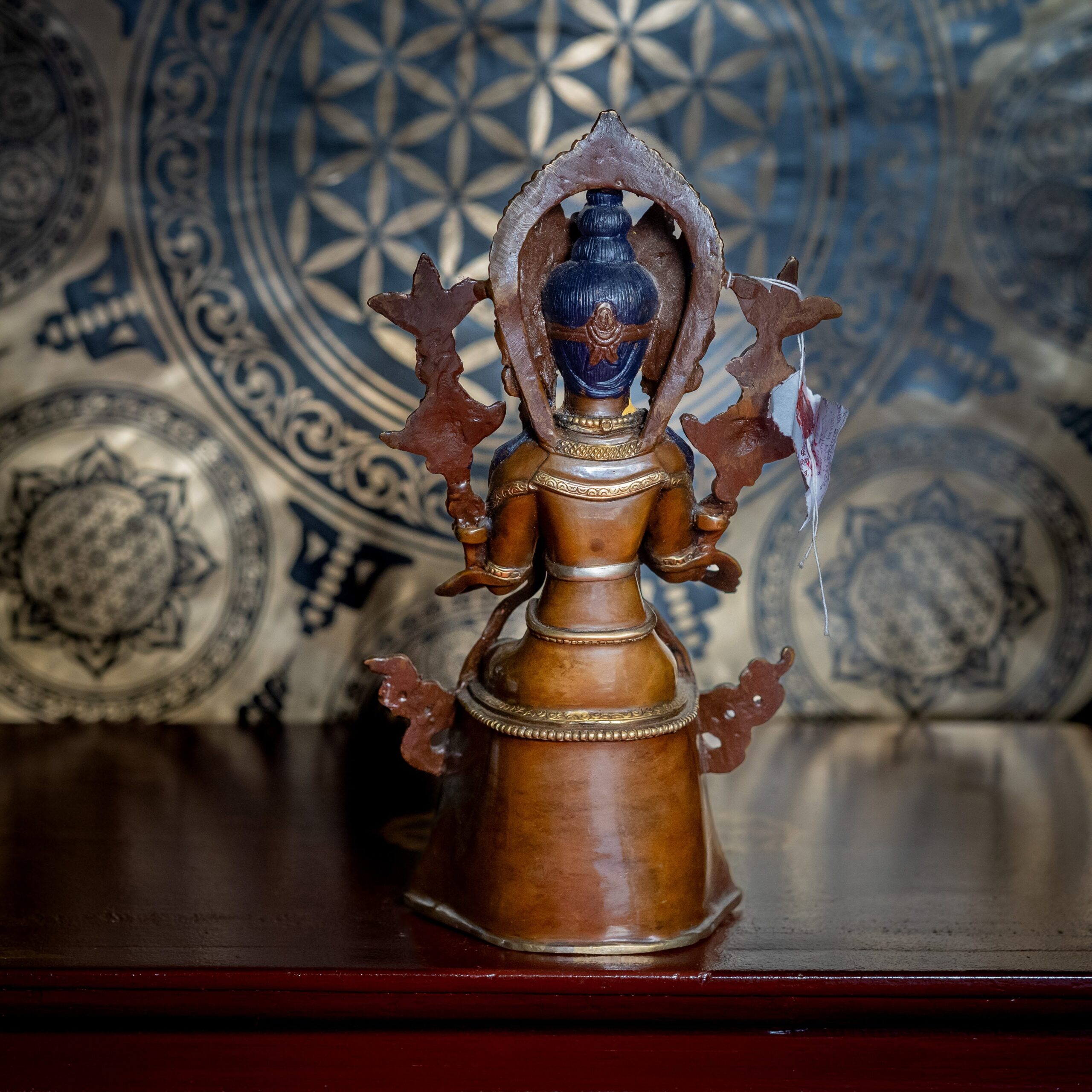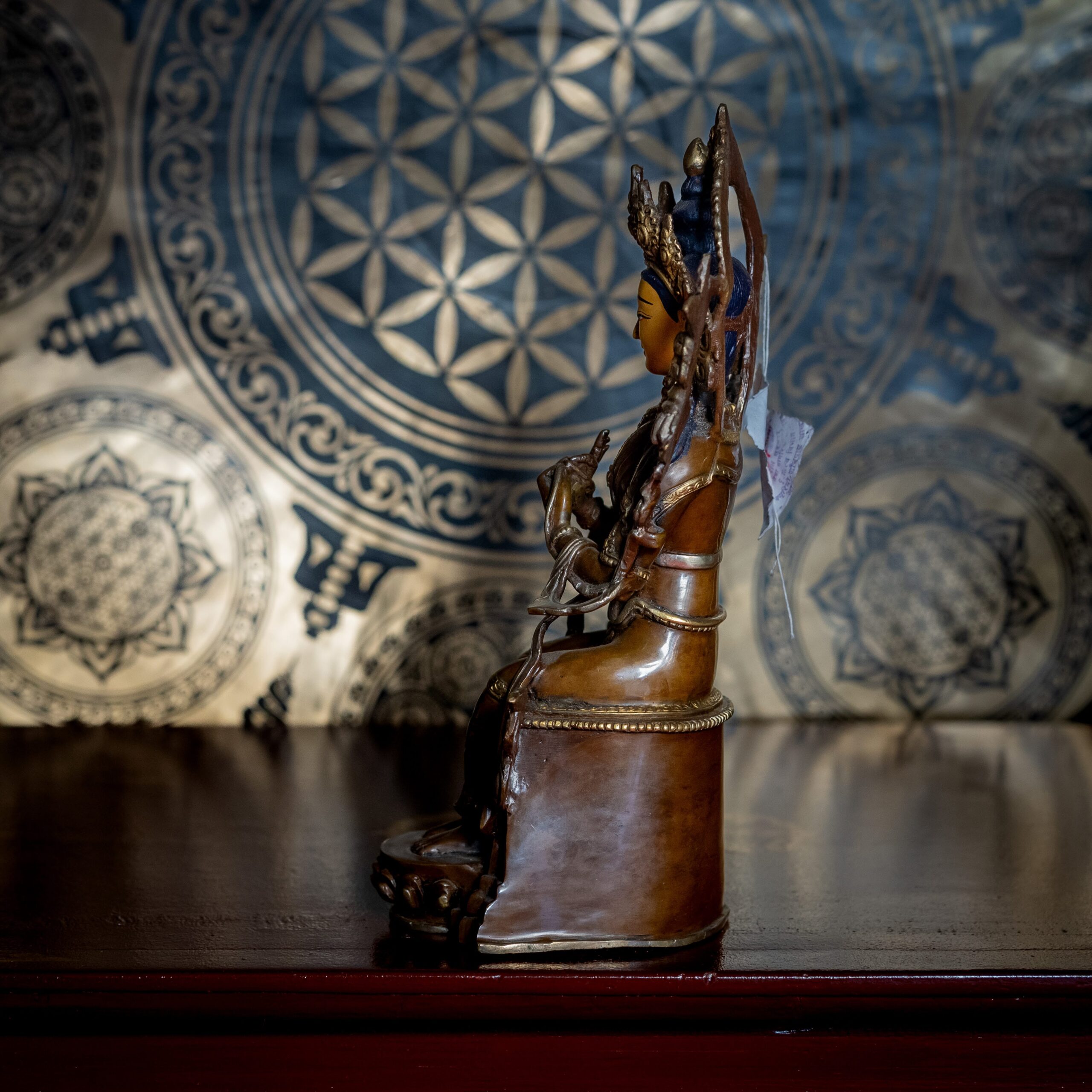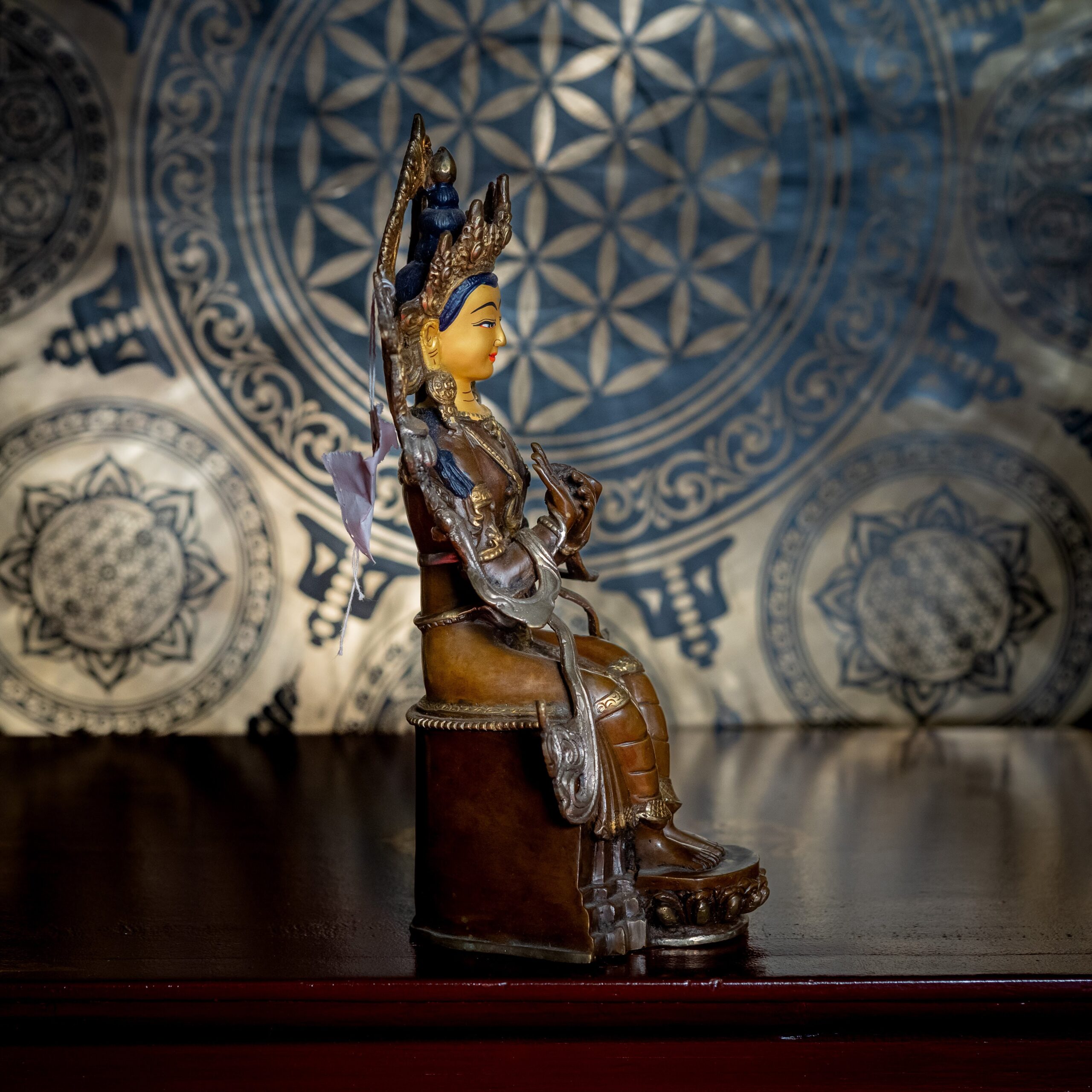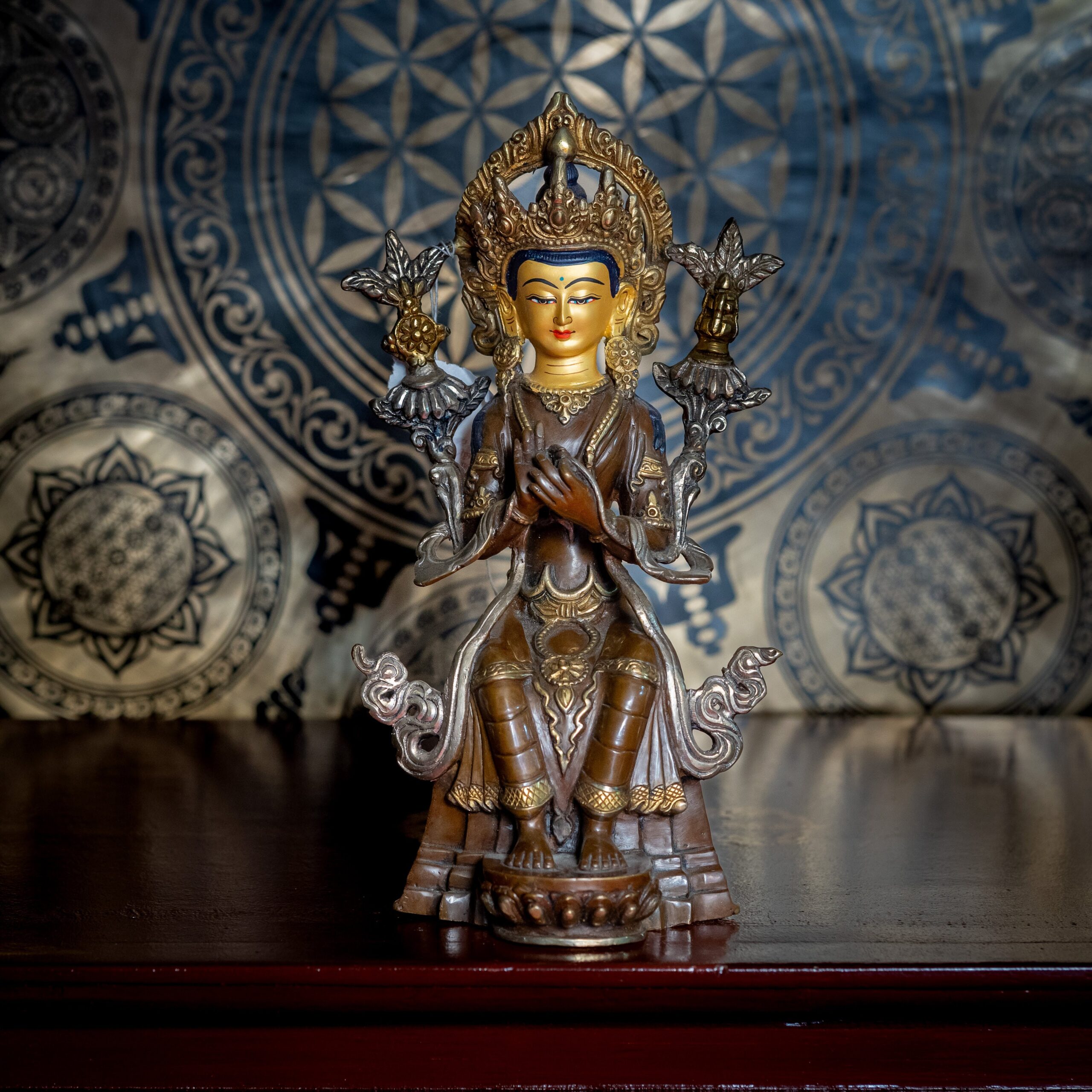 Iconografia e Simbologia Buddha Maitreya è solitamente raffigurato seduto su un trono, pronto ad alzarsi per scendere nel mondo. In questa rappresentazione è in atteggiamento benedicente, con la mano destra nel gesto della protezione (Abhaya Mudra) e la sinistra in grembo, con una coppa del nettare della lunga vita. Il suo volto sereno irradia una compassione pacifica e un sorriso fiducioso, riflesso della sua natura amorevole. Il suo corpo è spesso adornato da ornamenti regali: ciò rappresenta il suo status ancora “non manifestato” come Buddha, in attesa di compiere la missione salvifica per l’umanità. Significato spirituale: