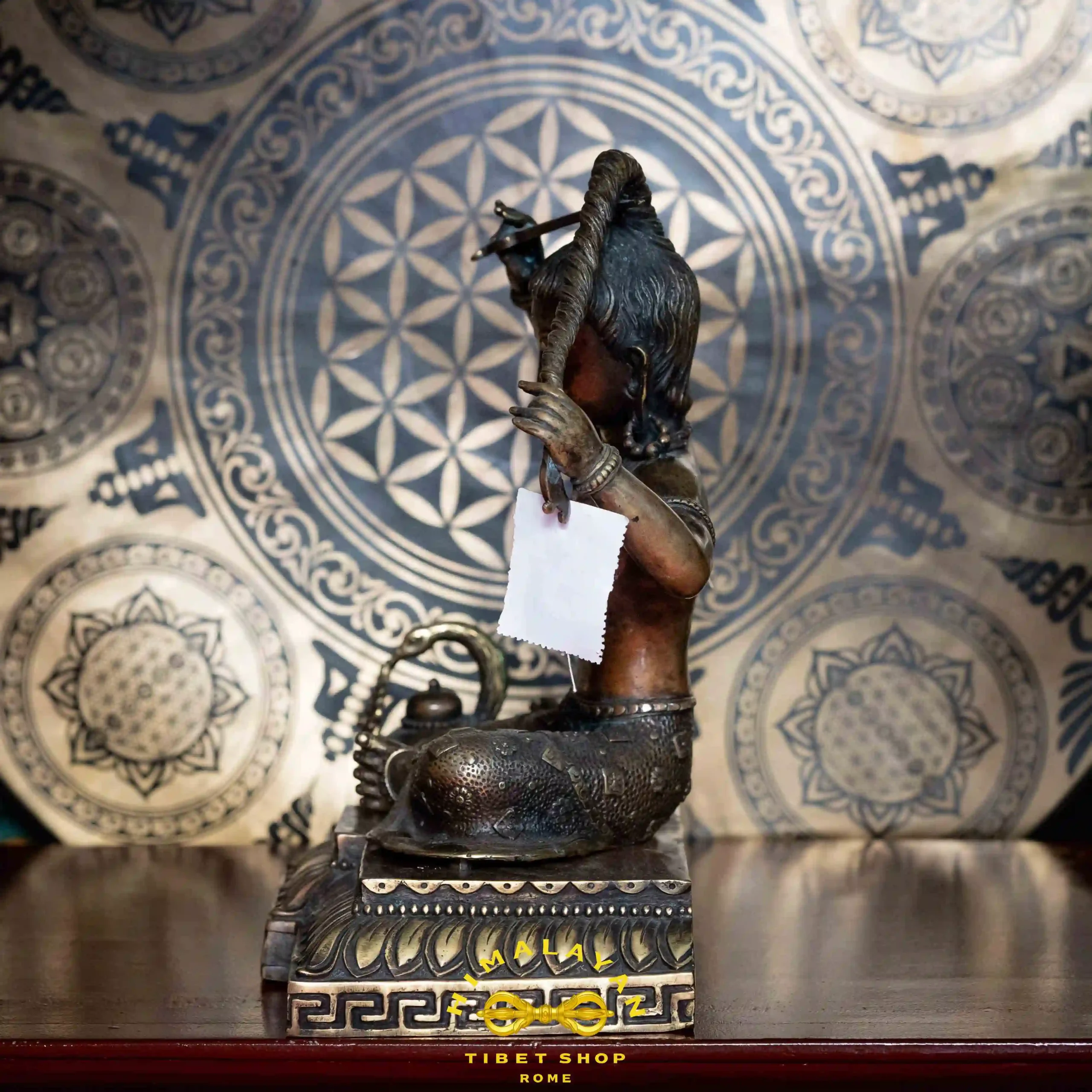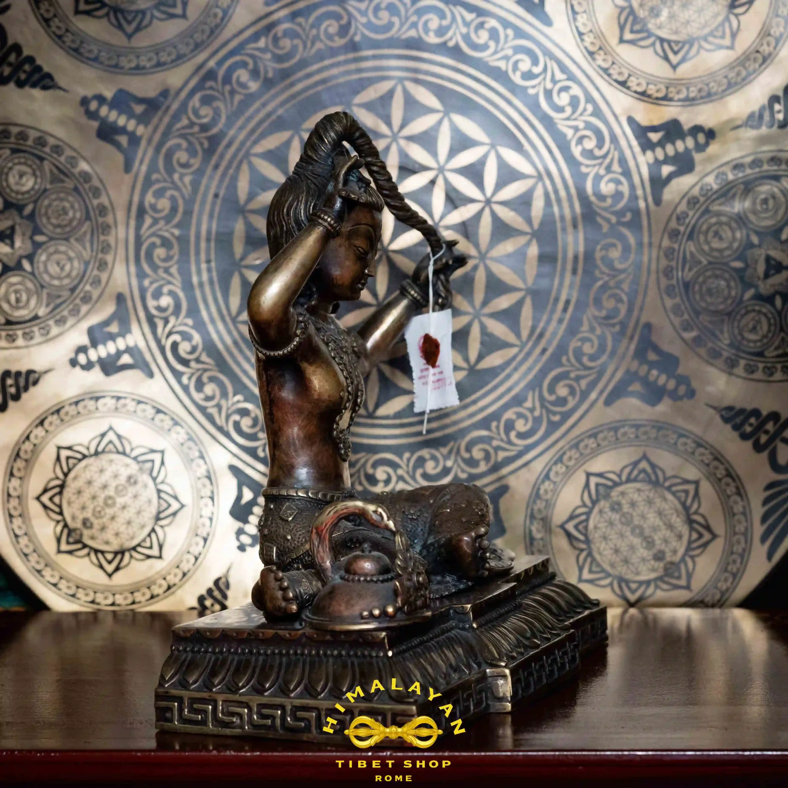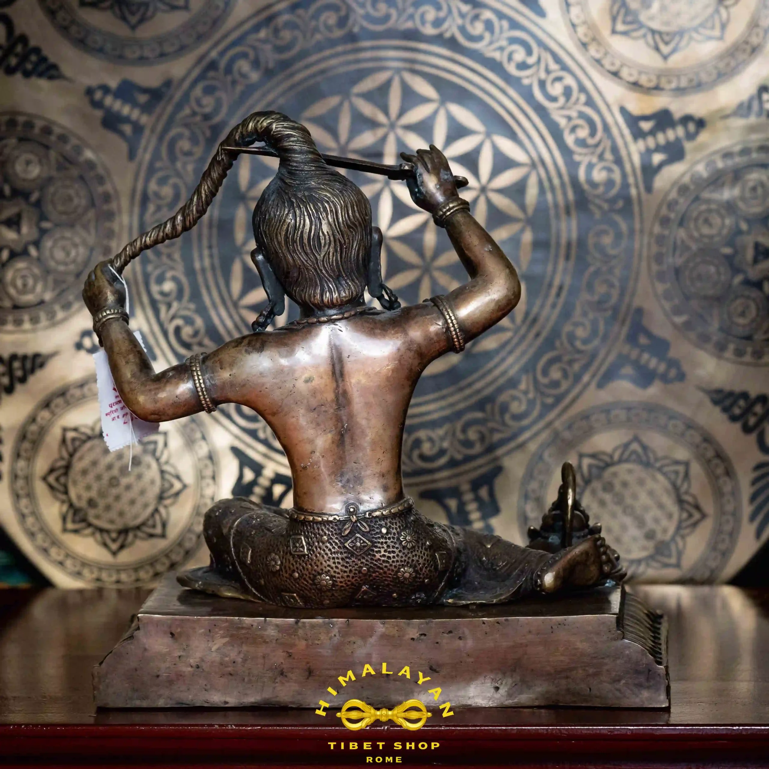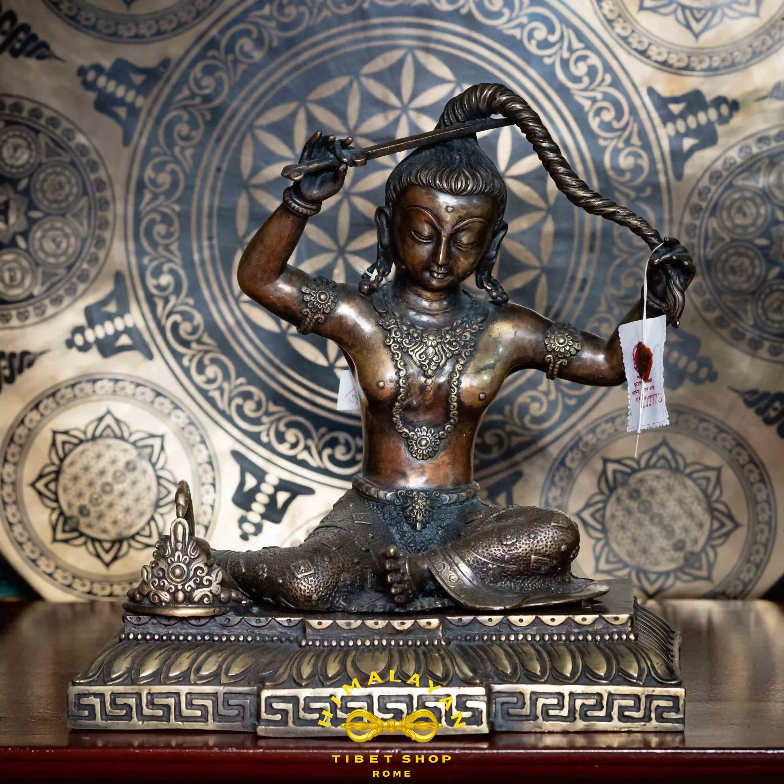 Realizzata secondo la tradizione artigianale tibetana, la statua mostra dettagli raffinati: il volto sereno e concentrato, i ricchi ornamenti incisi e la postura meditativa, che trasmettono pace e consapevolezza. La qualità del bronzo e la lavorazione accurata rendono questa scultura non solo un oggetto sacro, ma anche una preziosa opera d’arte da collezione.