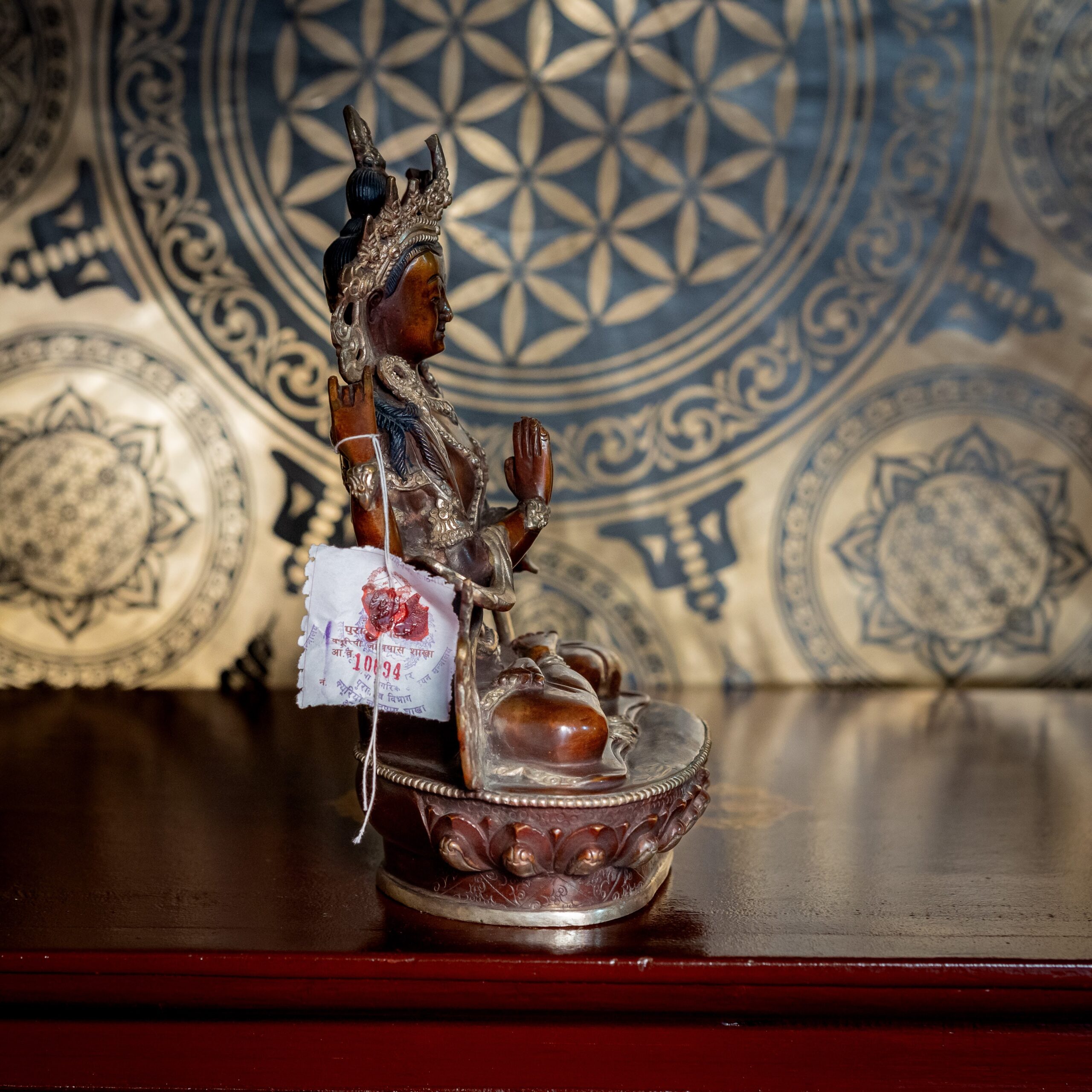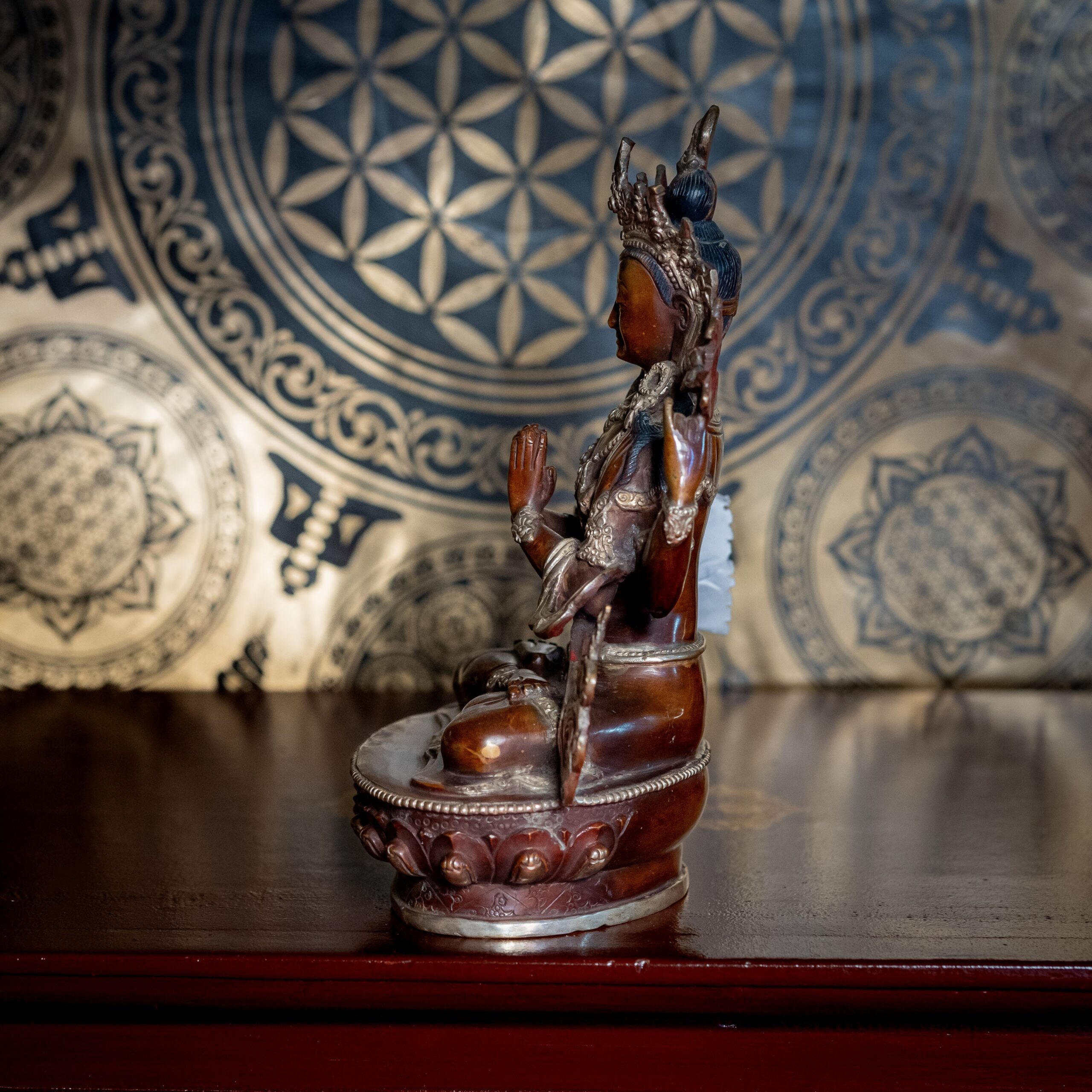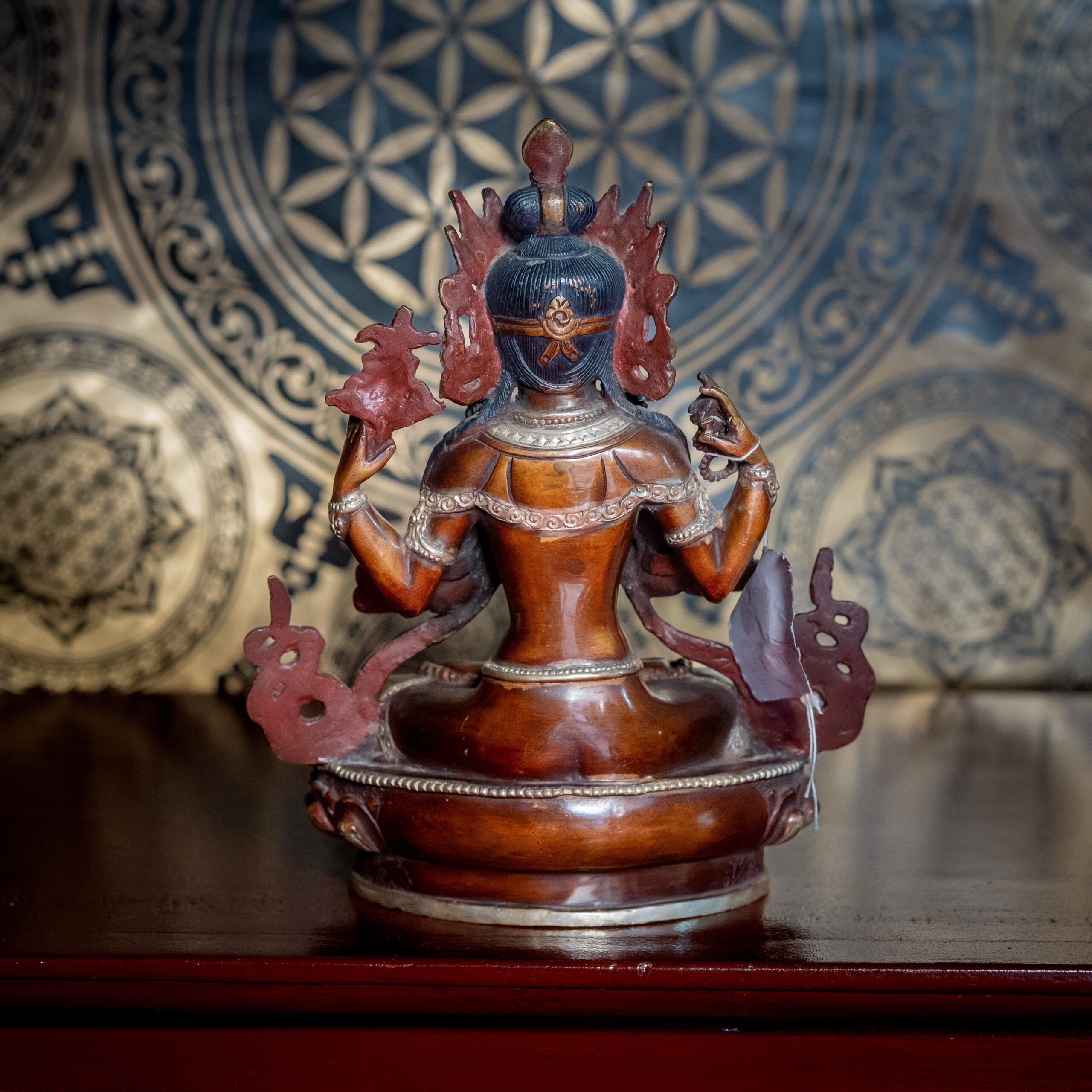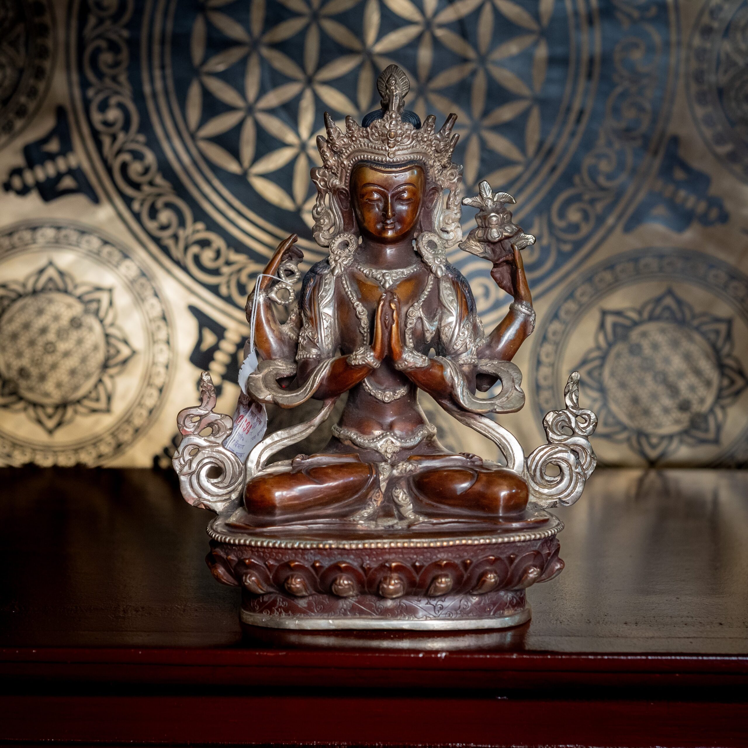 Statua di Chengresi a 4 Braccia – Il Buddha della Compassione Infinita Questa splendida statua in bronzo argentato raffigura Chengresi (Avalokiteshvara in sanscrito), il Buddha della Compassione, nella sua forma a quattro braccia, simbolo delle sue innumerevoli attività benefiche per liberare tutti gli esseri dalla sofferenza del samsara. Secondo la tradizione del Buddhismo tibetano, la compassione è il desiderio profondo che nessun essere sperimenti dolore o infelicità. La recitazione del suo famoso mantra a sei sillabe, “Om Mani Padme Hum”, ha il potere di purificare le emozioni afflittive e risvegliare la mente al potenziale della saggezza illuminata. Nella sua iconografia a quattro braccia: