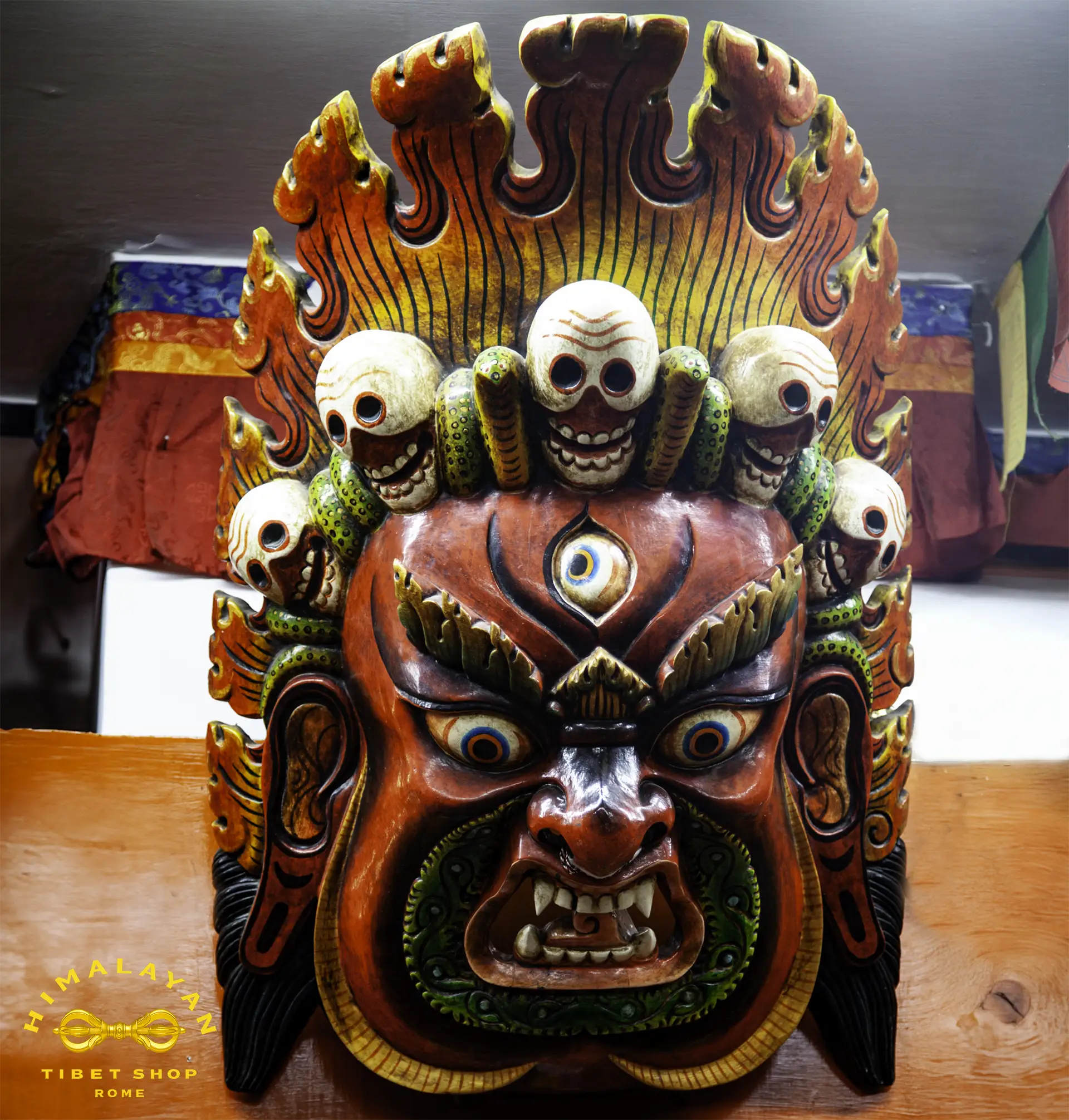 Ogni maschera è intagliata e dipinta a mano da artigiani dell’area himalayana, seguendo motivi tradizionali. Le proporzioni importanti la rendono perfetta come centrotavola murale, per un altare personale o per spazi di meditazione, studi o negozi a tema etnico/spirituale.