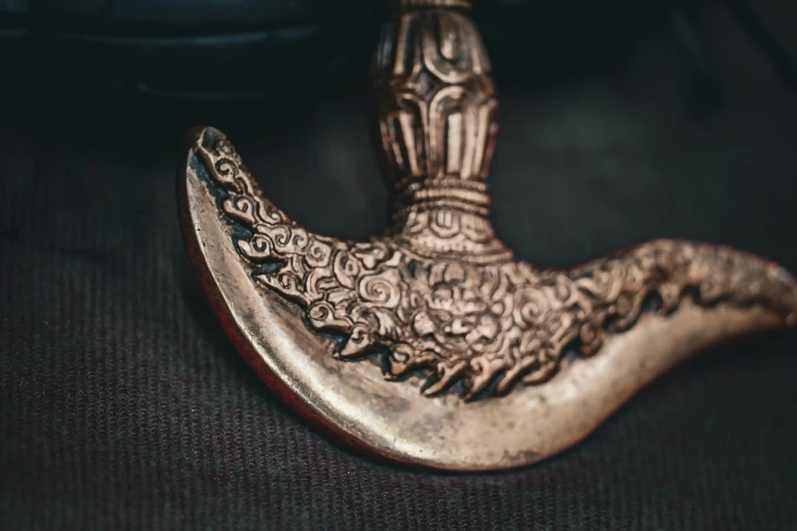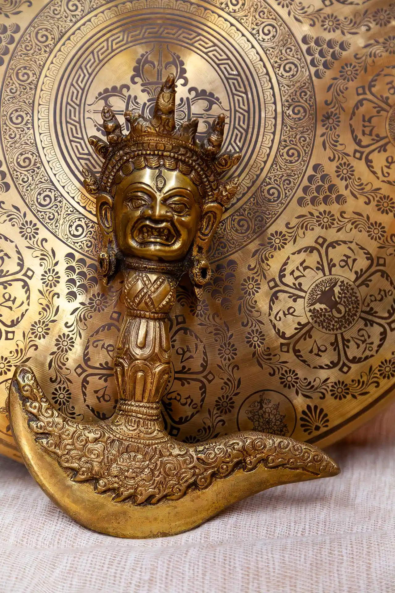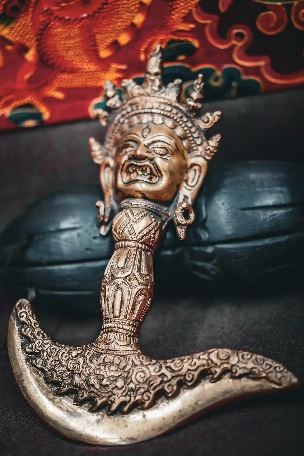 La testa di Mahakala, divinità irata e protettore del Dharma, conferisce a questo oggetto un’energia intensa di protezione, forza spirituale e trasformazione karmica. Mahakala è il guardiano delle pratiche tantriche e simbolo del tempo che dissolve l’ego e l’ignoranza.
