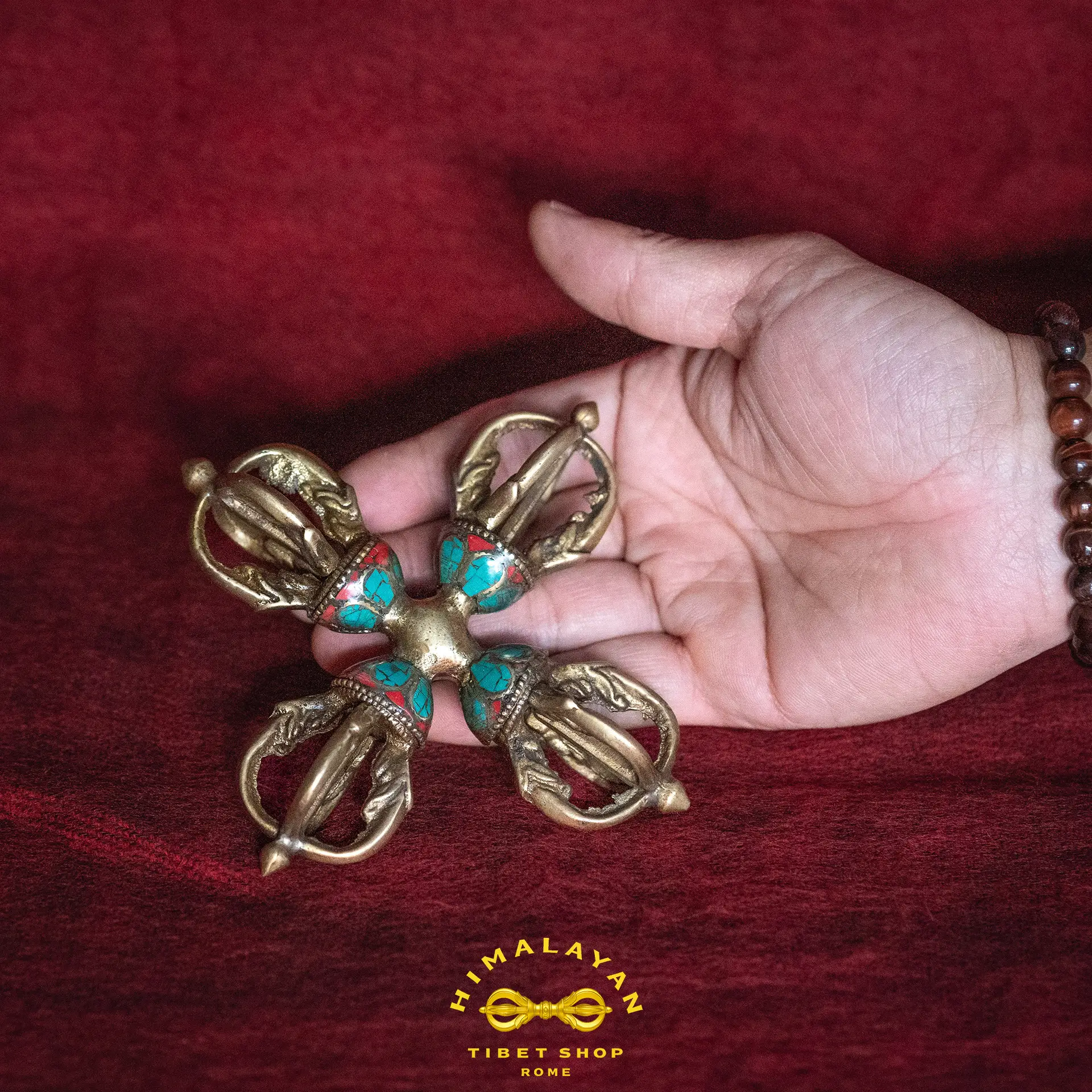 Nel rituale tibetano il doppio vajra simboleggia le quattro direzioni e la perfetta armonia degli elementi, ed è utilizzato come oggetto sacro sugli altari o come strumento meditativo per favorire equilibrio, concentrazione e protezione spirituale.