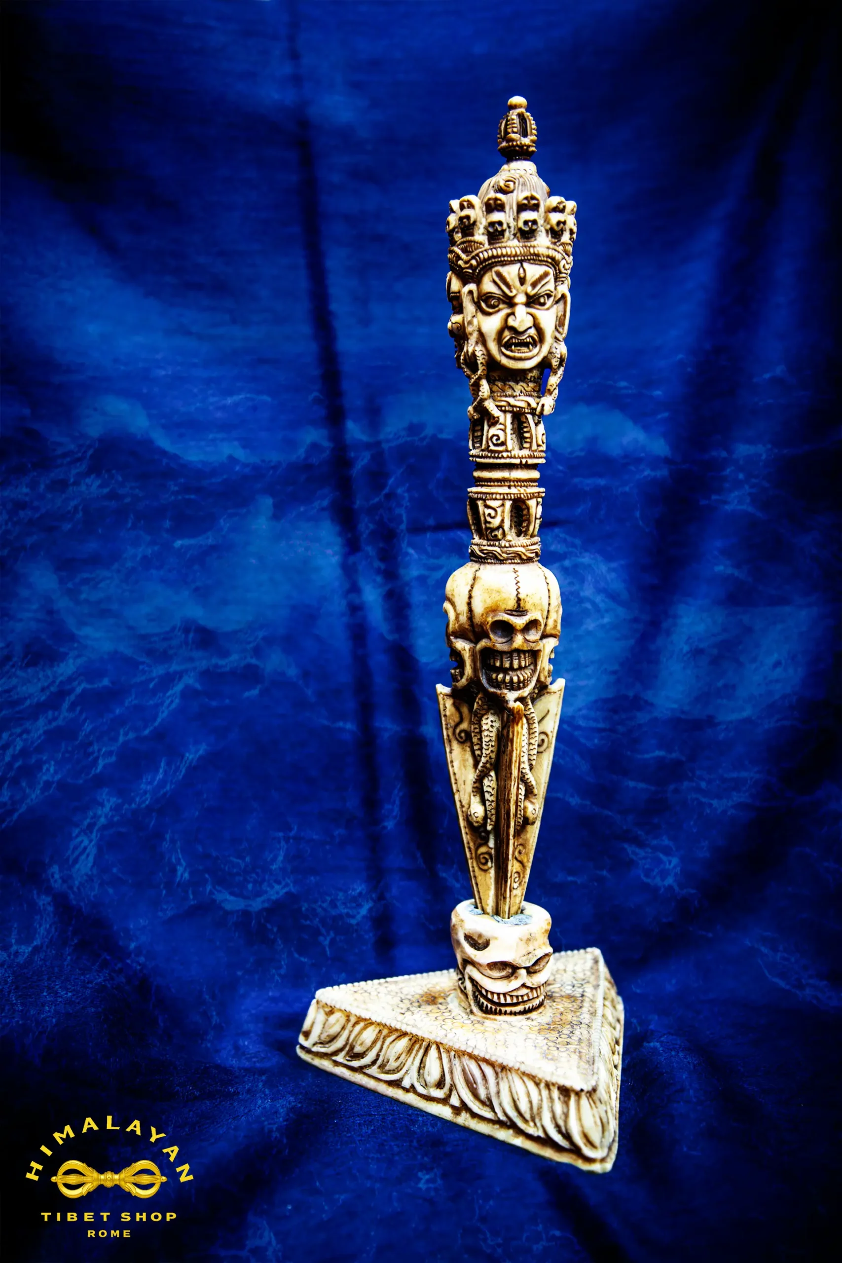 La presenza di Mahakala, divinità irata e protettrice del Dharma, rafforza l’energia del phurba, rendendolo particolarmente indicato per rituali di protezione, meditazione profonda e per la consacrazione di altari spirituali.