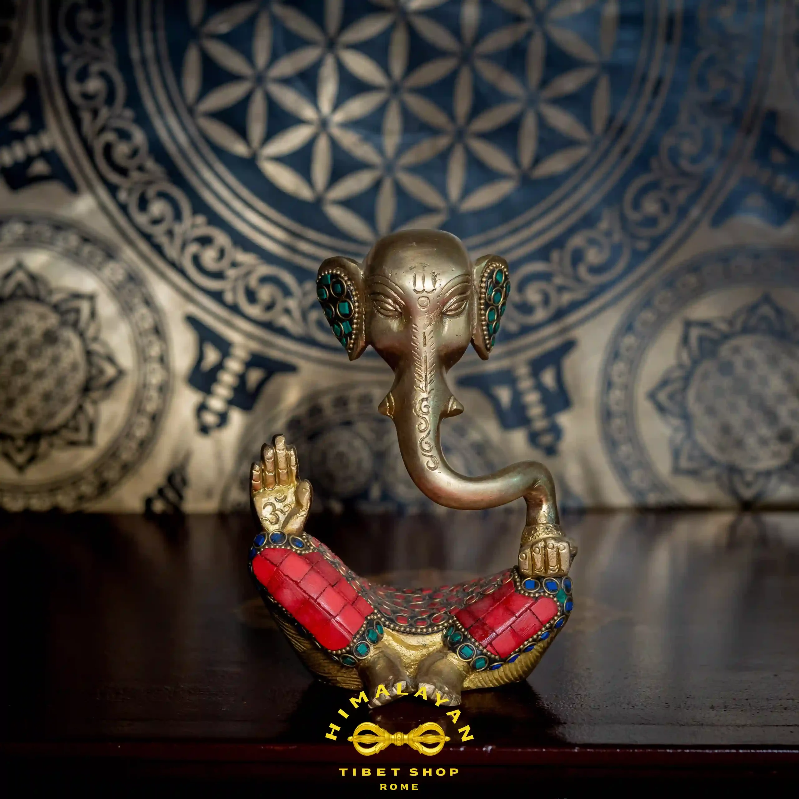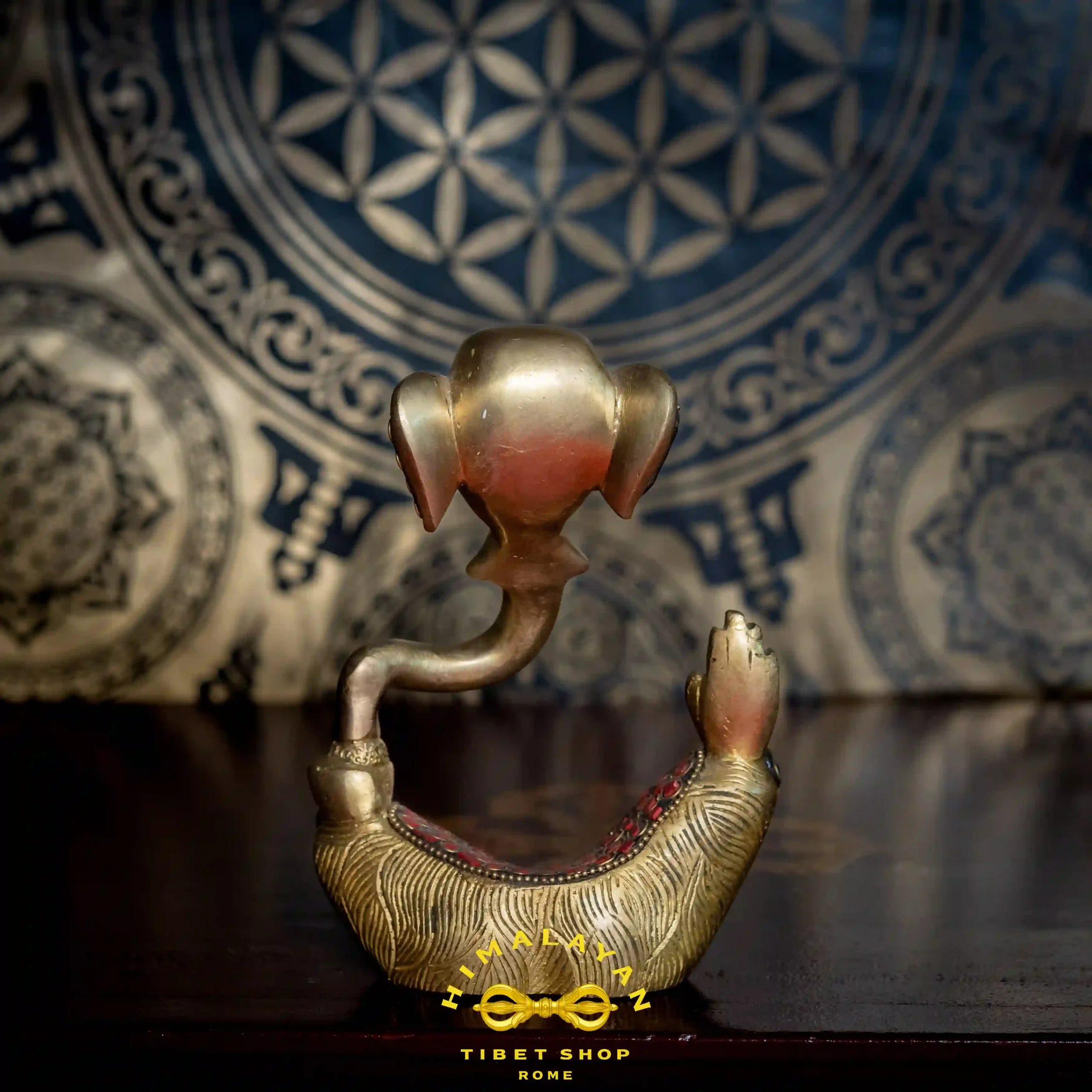 L’artigiano ha scelto di eliminare la figura corporea per concentrare l’attenzione sull’essenza della divinità: la testa di elefante, simbolo di saggezza e intelligenza superiore, e le mani che incarnano gesti di profonda spiritualità.