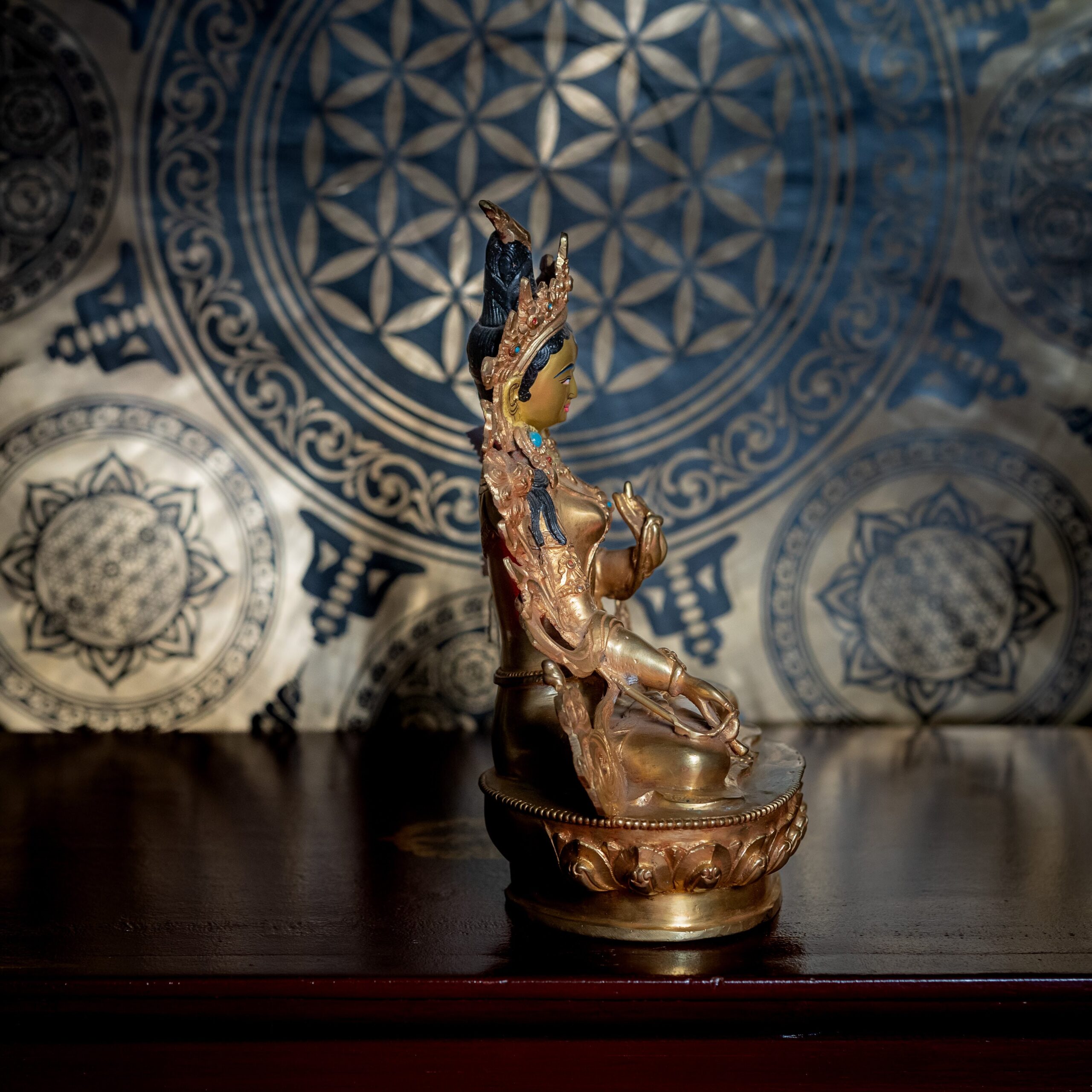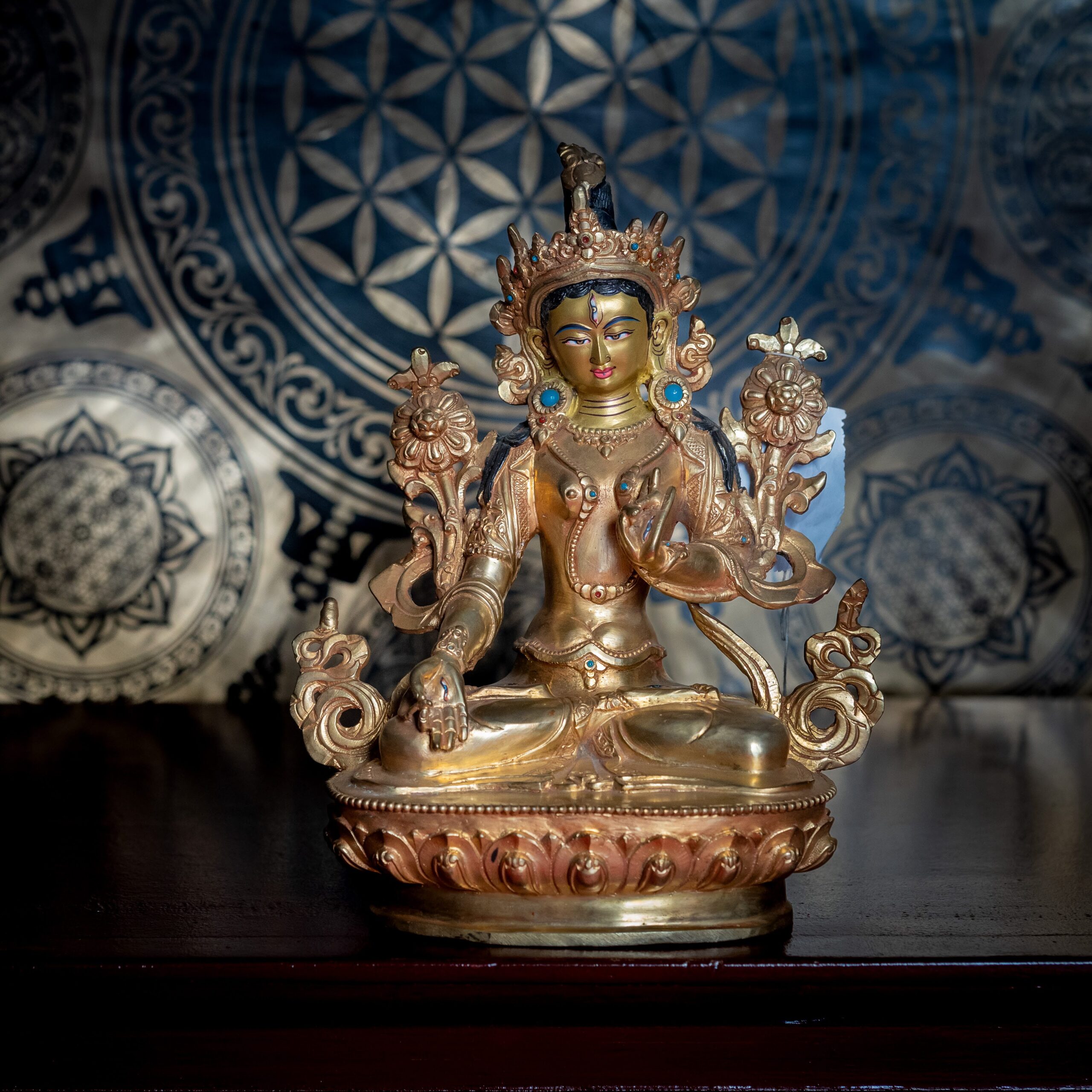 il Buddha femminile della compassione. Tara Bianca – conosciuta anche come Sita Tara – è l’aspetto pacifico e luminoso della Liberazione dagli otto veleni e dalla malattia, associata alla guarigione, alla longevità e alla protezione dalla morte prematura. È considerata un rifugio sicuro per chi desidera proseguire la propria pratica spirituale in salute e con forza.