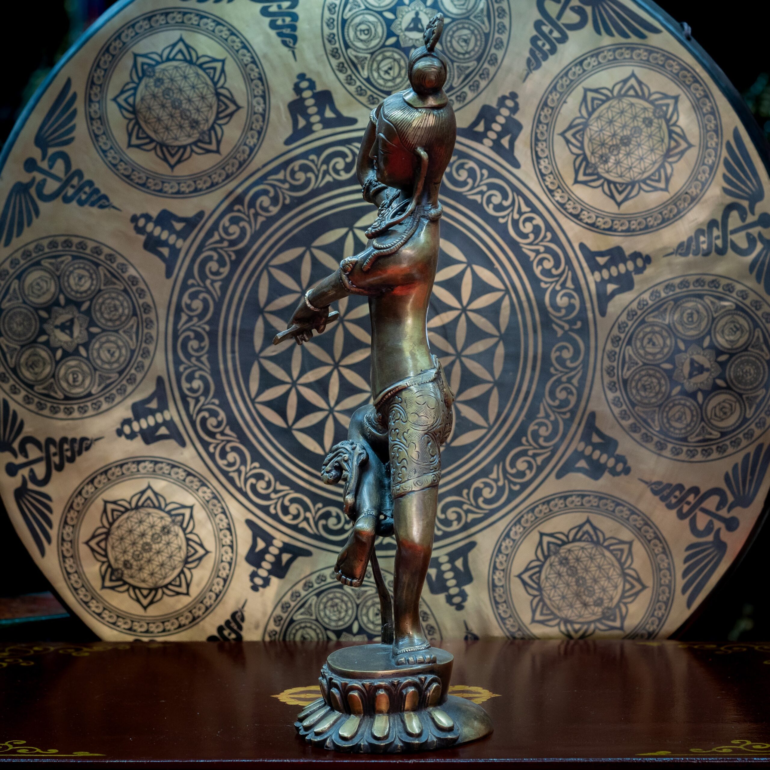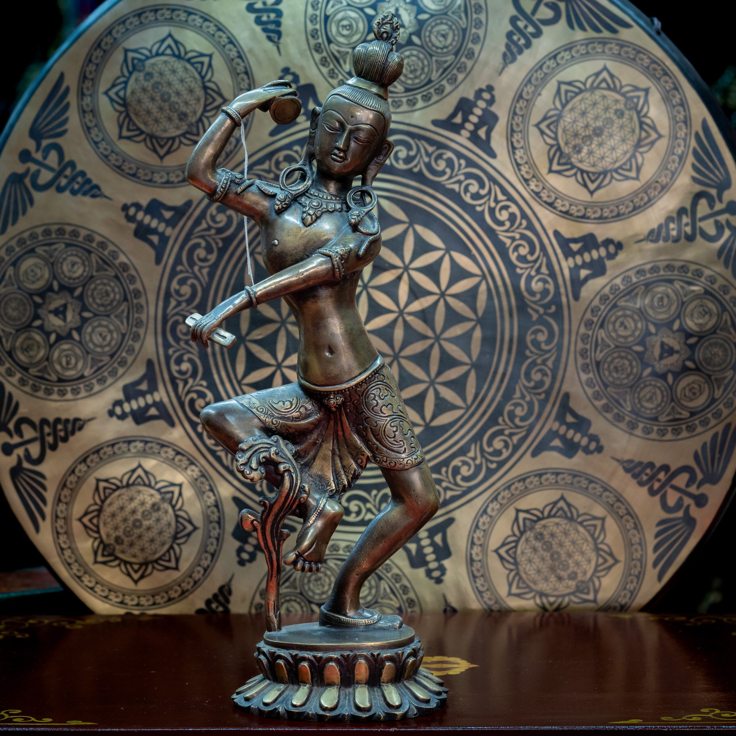 Vajrayoginī Danzante – La Danza della Liberazione La Vajrayoginī danzante ci guida nel percorso verso l’Illuminazione, mostrandoci come purificare e risvegliare la nostra essenza femminile originaria: la natura di Dakini, energia libera, primordiale e trasformativa. Il termine sanscrito ḍākinī è connesso al tamburo rituale (ḍamaru), strumento sacro delle pratiche sciamaniche femminili. In questa potente rappresentazione, la Dakini Suprema tiene il damaru nella mano destra, scandendo il ritmo sacro della creazione cosmica. Il suono ritmico induce uno stato di trance: il corpo si lascia attraversare dall’energia, danza e si fa ponte tra il mondo fisico e quello divino. Nella mano sinistra, Vajrayoginī sorregge il libro degli insegnamenti del Dharma, simbolo della retta via. È la presenza della saggezza che guida e armonizza l’energia, senza la quale la danza sarebbe solo movimento privo di direzione. Il Dharma conferisce senso, equilibrio e orientamento alla liberazione. Questa statua non è solo un oggetto sacro, ma una manifestazione viva dell’energia spirituale femminile: forza, saggezza, trasformazione. Un’opera capace di trasmettere benedizione, ispirazione e potere a chi entra in contatto con la sua vibrazione. Perché scegliere la statua di Vajrayoginī danzante? Simbolo potente di liberazione e trasformazione interiore Connessione diretta con l’energia femminile sacra del Vajrayāna Oggetto d’arte spirituale realizzato a mano da artigiani nepalesi Ideale per spazi sacri, meditazione, altari o come fonte d’ispirazione quotidiana Una presenza che porta forza, chiarezza e risveglio nella propria vita.